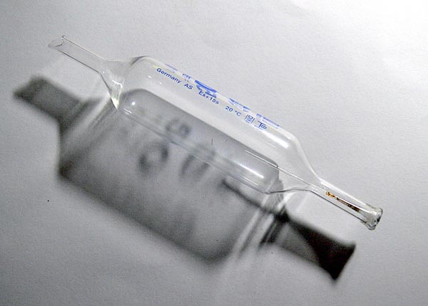 Берём мерную пипетку, укорачиваем её концы с помощью надфиля с алмазным напылением (подойдёт и пилочка для ногтей – ведь нам надо сделать лишь царапину на месте среза). Для этого надфиль прижимаем к месту среза и прокручиваем пипетку по или против часовой стрелке на один оборот, не больше (лучше слегка не докрутить, иначе царапина, оставленная надфилем, пройдёт по спирали и слом будет неровный). После чего ломаем как карандаш, двумя руками и слегка "растягивая" место разлома. Затем нагреваем один конец на газовой плите (можно воспользоваться и свечкой) и вставляем в него вторую пипетку. После остывания обламываем торчащий конец трубки, предварительно процарапав надфилем. Желательно оплавить срезы стекла, чтобы не пораниться и не порезать трубки.