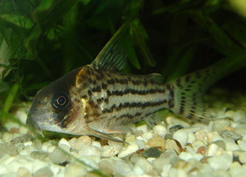 Не терпит высокую концентрацию соли или меди в воде. Похожие виды - C. bifasciatus, C. ornatus, C. parallelus и C. pulcher. Отличие: C. bifasciatus имеет 2-3 полосы, а C. parallelus 3-4 полосы, причем две центральные полосы расположены сверху и снизу соединения брюшных и спинных щитков, тогда, как у C. bifasciatus центральная (нижняя) полоса проходит по соединению брюшных и спинных щитков. C. ornatus имеет 5-6 полос вдоль тела, центральная полоса проходит по соединению брюшных и спинных щитков, тогда, как у C. schwartzi 4-5 полос, причем две центральные полосы расположены сверху и снизу соединения брюшных и спинных щитков. Также, у C. ornatus нет черного пятна на основании спинного плавника и на спине под ним, а у C. schwartzi есть. C. pulcher имеет три - четыре полосы, две хорошо заметные и еще одна-две слабо выраженные по спине и на животе, центральная полоса проходит по соединению брюшных и спинных щитков, тогда, как у C. schwartzi 4-5 полос, причем две центральные полосы расположены сверху и снизу соединения брюшных и спинных щитков. У C. pulcher нет черного пятна на основание спинного плавника и на спине под ним, а у C. schwartzi есть. C. parallelus имеет 3-4 полосы вдоль тела, которые более четкие, чем у C. schwartzi. Также, у C. schwartzi имеется черная вертикальная полоска, ограничевающая хвостовой плавник, тогда как у взрослых особей C. parallelus такой полоски нет. Правда у молодых рыб она может присутствовать. Хвостовой плавник у C. schwartzi с заметными вертикальными полосками, а у C. parallelus хвостовой плавник либо прозрачный, либо с очень слабо выраженными полосками. Дополнительное отличие - черное пятпо на спинном плавнике и на спине под плавником. У C. parallelus оно более выражено и занимает большую площадь, чем небольшое пятно у C. schwartzi, которое у некоторых особей полностью отсутствует. Также, у C. parallelus между спинным плавником и головой есть область оранжевой окраски. |